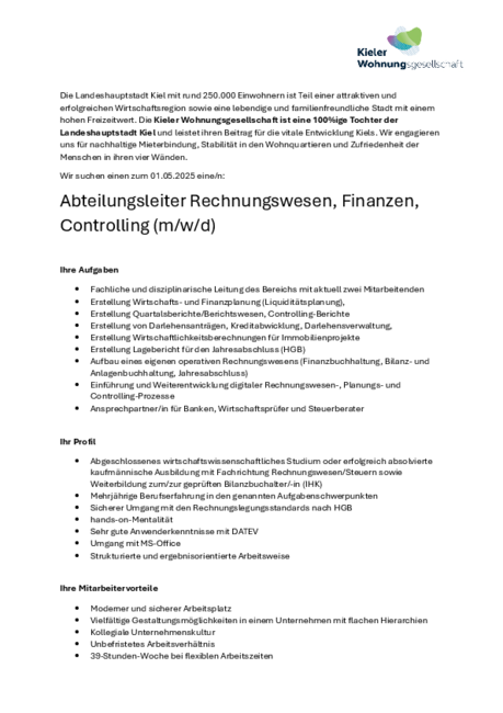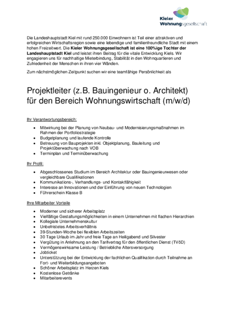 Die Landeshauptstadt Kiel mit rund 250.000 Einwohnern ist Teil einer attraktiven und erfolgreichen Wirtschaftsregion sowie eine lebendige und familienfreundliche Stadt mit einem hohen Freizeitwert.…